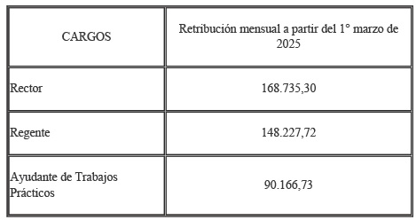 Retribución mensual correspondiente a los cargos de Rector, Regente y Ayudante de Trabajos Prácticos de la
