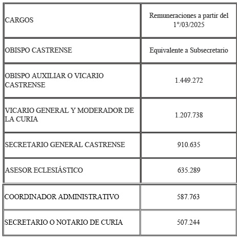Remuneraciones de los Integrantes de la Curia Castrense u Oficina Central del Obispado Castrense