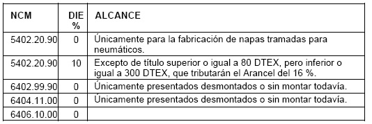 Que en el marco del Protocolo de Ouro Preto celebrado en diciembre de 1994, mediante la Decisión del CONSEJO DEL MERCADO COMÚN N° 22/94 se estableció un Arancel Externo Común (A.E.C.) para los tejidos, confecciones y calzado con niveles en general del CATORCE POR CIENTO (14 %) para hilados, DIECIOCHO POR CIENTO (18 %) para tejidos, VEINTE POR CIENTO (20 %) para confecciones y VEINTE POR CIENTO (20 %) para calzados, salvo algunas excepciones.