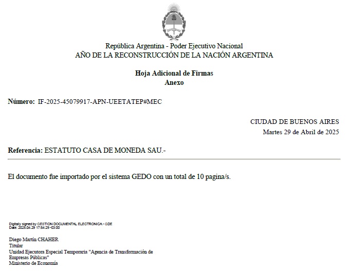 Que en cumplimiento de dicho mandato, el 20 de diciembre de 2024 se celebró la Asamblea General Extraordinaria de SOCIEDAD DEL ESTADO “CASA DE MONEDA” a través de la cual se dispuso su transformación en CASA DE MONEDA SOCIEDAD ANÓNIMA UNIPERSONAL y se aprobó su nuevo Estatuto Social, “ad referendum” del PODER EJECUTIVO NACIONAL.