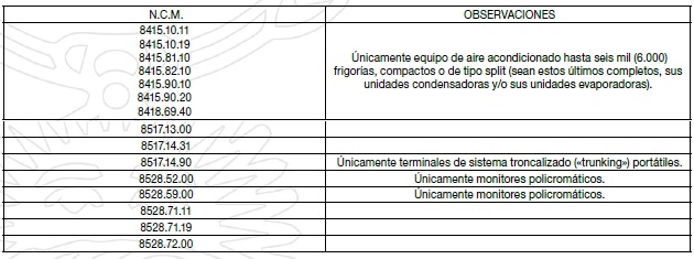 Que resulta necesario reducir transitoriamente la tasa del citado gravamen para determinadas mercaderías, tales como máquinas y aparatos para acondicionamiento de aire y sus partes, grupos frigoríficos, teléfonos, monitores y aparatos receptores de televisión, que clasifican en las posiciones arancelarias de la Nomenclatura Común del MERCOSUR (N.C.M.) 8415.10.11, 8415.10.19, 8415.81.10, 8415.82.10, 8415.90.10, 8415.90.20, 8418.69.40, 8517.13.00, 8517.14.31, 8517.14.90, 8528.52.00, 8528.59.00, 8528.71.11, 8528.71.19 y 8528.72.00 y establecer en CERO POR CIENTO (0 %) dicha tasa cuando los referidos bienes sean fabricados por empresas beneficiarias del régimen de la Ley N° 19.640, siempre que acrediten origen en la mencionada Área Aduanera Especial.
