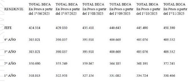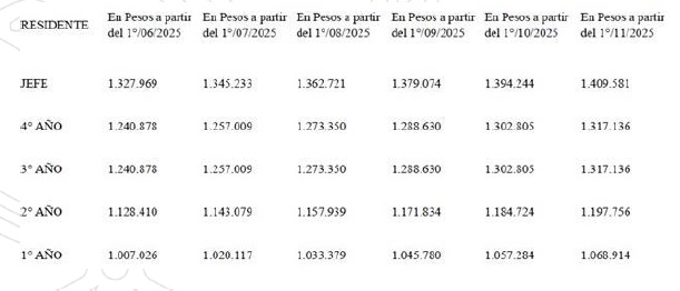ARTÍCULO 5°.- Fíjanse las remuneraciones de los Profesionales Residentes Nacionales que se desempeñan en los Establecimientos Hospitalarios e Institutos y Organismos que dependen del MINISTERIO DE SALUD y en el HOSPITAL DE PEDIATRÍA S.A.M.I.C. “PROFESOR DR. JUAN P. GARRAHAN”, conforme los valores y a partir de las fechas que se detallan a continuación: