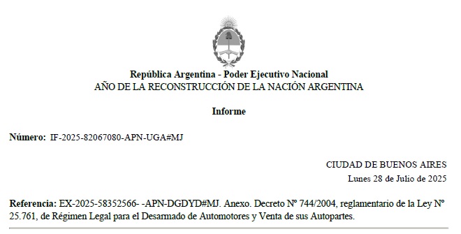 Que por el Decreto N° 428/25 se sustituyeron los artículos 4° y 10 de la Ley N° 25.761 y se dispuso la implementación por parte de la DIRECCIÓN NACIONAL DE LOS REGISTROS NACIONALES DE LA PROPIEDAD DEL AUTOMOTOR Y DE CRÉDITOS PRENDARIOS de una plataforma digital para la gestión de los legajos de baja y desarme de vehículos, así como la simplificación del trámite, con el fin de reducir los costos operativos, eficientizar el procedimiento de desarme y mejorar su trazabilidad.