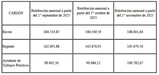 ARTÍCULO 2°.- Modifícase la retribución mensual correspondiente al cargo de Bedel del INSTITUTO SUPERIOR DE ENSEÑANZA RADIOFÓNICA (ISER), dependiente del ENTE NACIONAL DE COMUNICACIONES (ENACOM), establecida en el artículo 2° del Decreto N° 1530 del 21 de octubre de 2009 y sus modificatorios en PESOS NOVENTA Y OCHO MIL CIENTO SESENTA Y TRES ($98.163) a partir del 1º de septiembre de 2025, PESOS NOVENTA Y NUEVE MIL DOSCIENTOS CUARENTA Y TRES ($99.243) a partir del 1° de octubre de 2025 y PESOS CIEN MIL TRESCIENTOS TREINTA Y CINCO ($100.335) a partir del 1° de noviembre de 2025.
