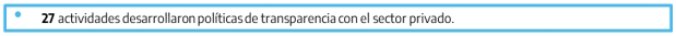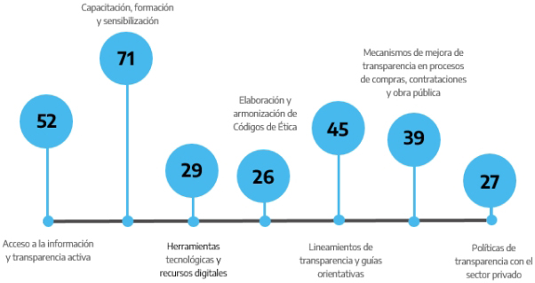 - Diseño e implementación de políticas de transparencia con el sector privado: las iniciativas de articulación con actores del sector privado son clave para ampliar el campo de entendimiento y acción de las políticas anticorrupción. En este sentido, resulta relevante identificar a interlocutores y partes interesadas en el diseño, implementación y seguimiento de políticas públicas, a fin de generar una coordinación hacia afuera de los organismos y evitar desvíos del interés público y procesos de captura de las decisiones públicas.