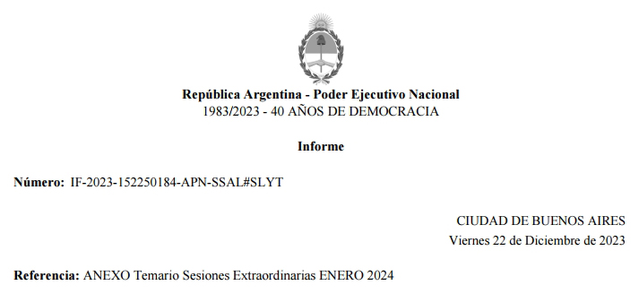CONVOCASE AL HONORABLE CONGRESO DE LA NACION A SESIONES EXTRAORDINARIAS DESDE EL 26 DE DICIEMBRE DE 2023 HASTA EL 31 DE ENERO DE 2024.