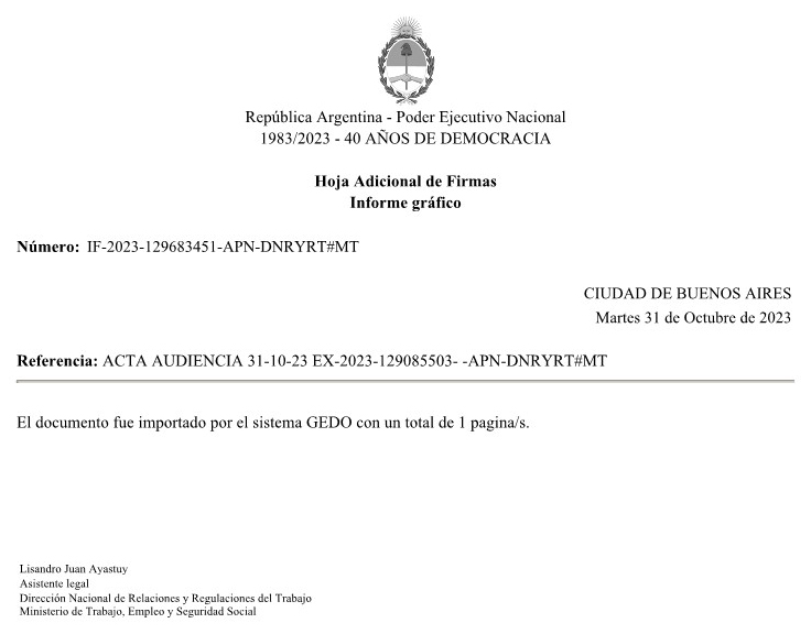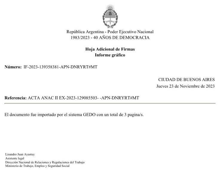 //En la Ciudad Autónoma de Buenos Aires, a los 13 días del mes de NOVIEMBRE de 2023, siendo las 14:00 horas, en el MINISTERIO DE TRABAJO, EMPLEO Y SEGURIDAD SOCIAL DE LA NACIÓN, y reabriendo el acto de audiencia de fecha 31 de octubre de 2023, ante la Dra. Mara MENTORO Directora de la DIRECCIÓN DE ANÁLISIS LABORAL DEL SECTOR PÚBLICO, acompañada por el Dr. Lisandro AYASTUY Secretario de Conciliación, en el marco de la Comisión Negociadora Sectorial para el Personal de la Administración Nacional de Aviación Civil (ANAC), COMPARECEN: por la JEFATURA DE GABINETE DE MINISTROS, la Sra. SECRETARIA DE GESTIÓN Y EMPLEO PÚBLICO, Dra. Ana G. CASTELLANI, acompañada por la Lic. Paula RECALDE POLARI, el Sr. SUBSECRETARIO DE COORDINACIÓN PRESUPUESTARIA, Lic. Ignacio LOHLE, y por el MINISTERIO DE ECONOMÍA, el Sr. SUBSECRETARIO DE PRESUPUESTO, Lic. Jorge DOMPER, acompañado por el Dr. Jorge CARUSO, y por la ADMINISTRACIÓN NACIONAL DE AVIACIÓN CIVIL los Sres. Fernando BRAVO, Gonzalo ECHEBARRENA, Leandro DACOBA, Ricardo SANDOVAL QUIROZ y Ricardo SERRAGO y la Sra. Ayelen ROBLES todos ellos por parte del Estado Empleador, y por la Parte Gremial, en representación de la UNION DEL PERSONAL CIVIL DE LA NACION (UPCN), los Sres. Diego ROSANO, Federico ROBAUDI y la Sra. Melisa ROBAUDI en su carácter de asesor, y en representación de la ASOCIACIÓN TRABAJADORES DEL ESTADO (ATE) LA Sra. Mercedes CABEZA acompañada por los Sres. Marcelo BELELLI, Víctor QUINTEROS, Fernando GATICA, Javier HERRERA, Luis HURTADO, Pablo RETAMAR, Juan LUCERO y Sra. Carla MANCINI y el Dr. Rodrigo EXPOSITO.