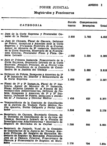 FIJANSE EN LOS MONTOS QUE SE DETALLAN EN EL ANEXO I, QUE FORMAN PARTE DE LA PRESENTE LEY, LAS REMUNERACIONES DE LOS SEÑORES JUECES DE LA CORTE SUPREMA DE JUSTICIA, DE LOS MAGISTRADOS Y FUNCIONARIOS DEL PODER JUDICIAL Y DE LOS MIEMBROS DEL MINISTERIO PUBLICO.