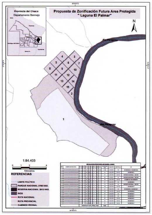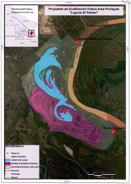 Artículo 3º- Créase el Parque Nacional y Reserva Nacional LAGUNA EL PALMAR, bajo los términos de la ley nacional N° 22.351 -Régimen Legal de los Parques Nacionales, Monumentos Naturales y Reservas Nacionales, en el área que abarca la extensión y distribución territorial descripta en el artículo 1º, ubicada en el Departamento de Bermejo, provincia del Chaco, y cuyos límites se fijan de acuerdo con el mapa que obra como Anexo II “Propuesta de zonificación futura Área Protegida “Laguna El Palmar” del Parque Nacional y la Reserva Nacional Laguna El Palmar”, sujeto a mensura para perfeccionamiento de límites parcelarios.